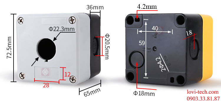 Trên nắp hộp có thiết kế sẳn lỗ để lắp nút nhấn phi 22. Tùy nhu cầu điều khiển mà ta sử dụng loại hộp 1 lỗ, 2 lỗ, 3 lỗ, 4 lỗ, 5 lỗ . Đặc biệt trên lỗ lắp nút có thêm rãnh để chống xoay khi sử dụng nút dừng khẩn cấp Emergency Stop và nút chọn chế độ Select Switch.